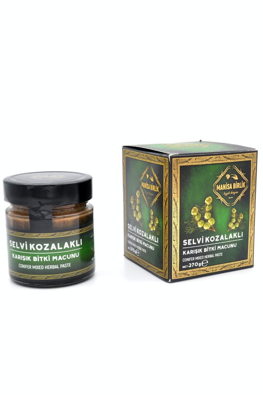 - Pratik Ambalaj: 270 gramlık cam kavanozunda sunulan Manisa Birlik Selvi Kozalaklı Macun, kolayca taşınabilir ve saklanabilir.